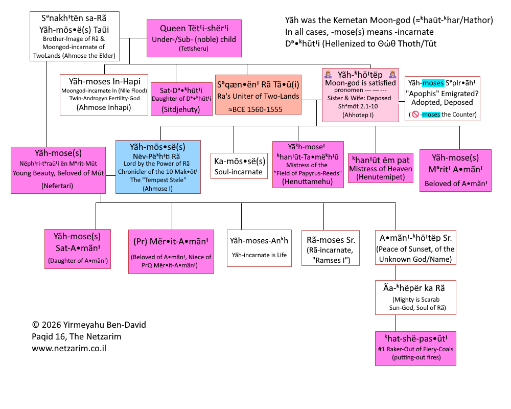 then incorrectly corrupted by modern scholars to "Ahmose I"). In fact, his grandfather, Sen-akht-en- Rã Yãᵏh-moses, was ("Ahmose I")!
