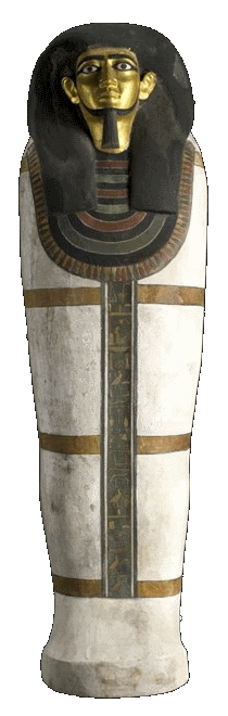 In Egypt, funerary custom had recently adopted this new, form-fitting style mummy-coffin, which displaced the earlier rectangular box coffins. Shown is the mummy-coffin of the Deputy Par•ohꞋ over the Oryx Nome,