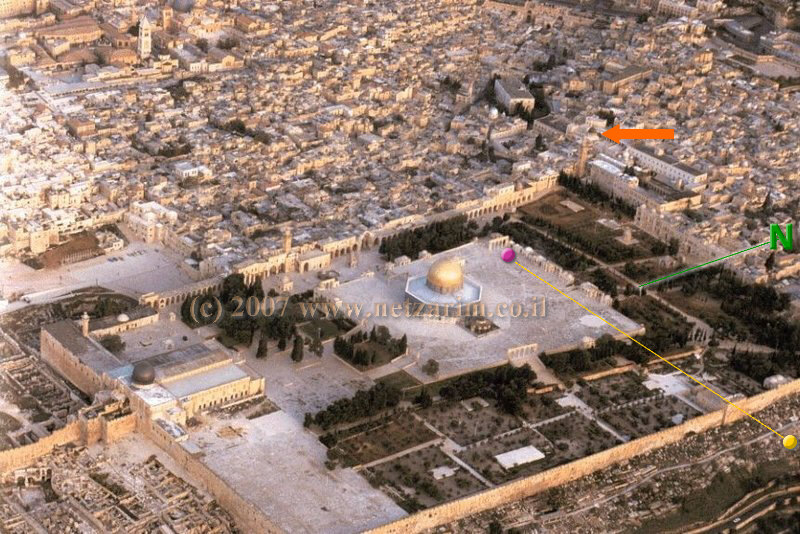 Yᵊkhëz•qeilꞋ [8.16] that [ërꞋëv ùÑÇáÌÈú]… As soon as ùÑÇáÌÈú was over, he took out a map of éÀøåÌùÑÈìÇéÄí and began tracing out east-west lines of sight from the top of the Mount of Olives to the Temple Mount about 800 meters distant. Kaufman presumed that the ceremony was conducted near the crest in order to permit the priest to look over the eastern Temple compound wall. (Although this wall was lower than the rest, it could not be too low because the Temple was also a walled fortress.)The flat crest of the Mount of Olives for the most part was too northerly to permit an east-west line of sight to the Temple Mount: From the crest's southernmost end, however, Kaufman drew a line that reached the Temple Mount near the [ùÑÇòÇø äÈøÇçÂîÄéí – a key clue], about 95 meters from the center of the Dome of the Rock. There could be no east-west line of sight to the Dome of the Rock itself from the ridge crest.