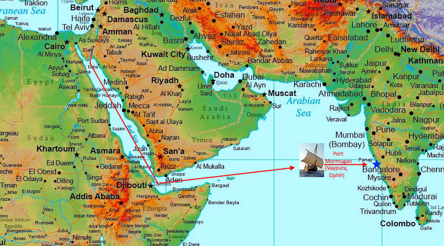 "Gold, almug (or algum) wood (i.e., sandalwood), ivory, monkeys, and peacocks… ¶ …the Jewish historian Josephus and St. Jerome evidently understood that India was the location of Ophir [אוֹפִיר]. The Hebrew words for the products of Ophir may be derived from Indian languages; furthermore, sandalwood and peacocks are commonly found in India, whereas, at least in modern times, they do not exist in East Africa." https://www.britannica.com/place/Ophir