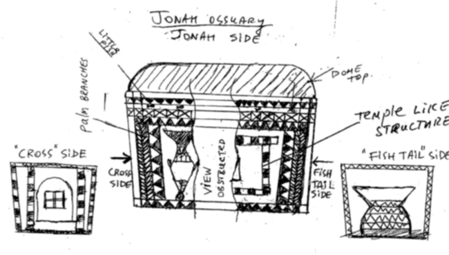 On 2012.04.19, Eurekalert.org published news that Prof. James H. Charlesworth (Princeton Theological Seminary) has read יונה in the head of the fish (or near the base of the amphora – or something else, depending on what it eventually turns out to be), lending increased credence to the identification by Prof. historian James D. Tabor (University of North Carolina at Charlotte) asserting that the ossuary image is a Christian ιχθυς, mouth pointed downward, spitting out a stick-figure image of "Jonah" – whose head is enveloped in seaweed. This, of course, is being heralded as possible proof of Christian tradition in the 1st century C.E. – before 135 C.E. In the aforementioned EurekAlert, Prof. Charlesworth finds the Hebrew letters יונה in the "stick-figure" of "Jonah."